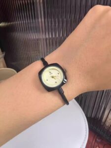 Minimalist with a bold twist, this black bangle-style women’s watch is crafted for those who love elegance with a modern edge. The glossy beige dial features three zircon hour markers and black hands, while the flexible twisted cable band offers a snug, cuff-like fit that’s easy to wear. The rounded square case adds a unique touch to its silhouette, making it perfect for daily wear or evening outfits.