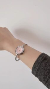 Minimalist with a bold twist, this pink bangle-style women’s watch is crafted for those who love elegance with a modern edge. The glossy pink dial features three zircon hour markers and golden hands, while the flexible twisted cable band offers a snug, cuff-like fit that’s easy to wear. The rounded square case adds a unique touch to its silhouette, making it perfect for daily wear or evening outfits.