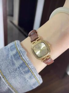 This stylish watch features a square gold-tone case with a minimalist dial in either deep green or soft gold. The sleek leather strap in classic black or rich brown adds an elegant touch, while the unique gold accents on the case provide a modern, sophisticated look. Perfect for those who appreciate simple yet luxurious design, this watch is an ideal choice for both casual and formal occasions.