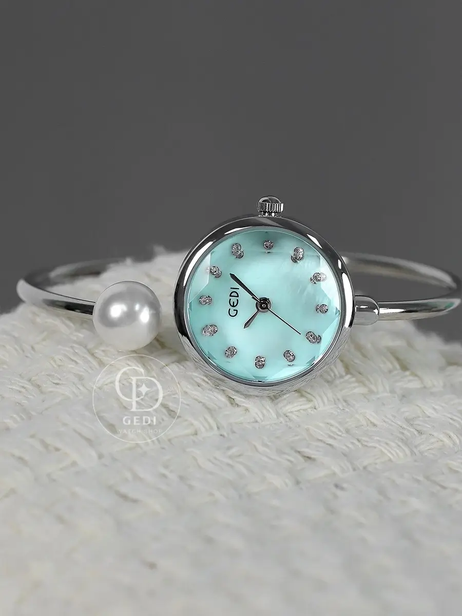This exquisite GEDI bangle watch is a stunning fusion of timeless elegance and modern jewelry design. Featuring a shimmering mother-of-pearl dial accented by sparkling crystal hour markers, it captures a soft, luminous glow from every angle. The slim tone open cuff is uniquely adorned with a signature pearl, creating a sophisticated silhouette that doubles as a delicate bracelet. Available in classic Gold, White, Blue, and Green, this minimalist timepiece is the perfect accessory for women who appreciate refined, jewelry-inspired luxury.