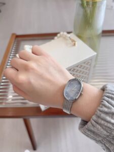 This elegant women’s watch features an oval-shaped case, a deep blue dial with crystal hour markers, and a refined silver mesh band. Its unique silhouette and sleek design make it the perfect statement piece for work, events, or everyday style.
