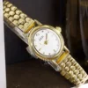 This elegant women’s watch features a delicate, small round dial paired with a polished gold-tone stainless steel bracelet. Minimal hour markers and a clean white dial create a refined, timeless look that feels light and graceful on the wrist.
