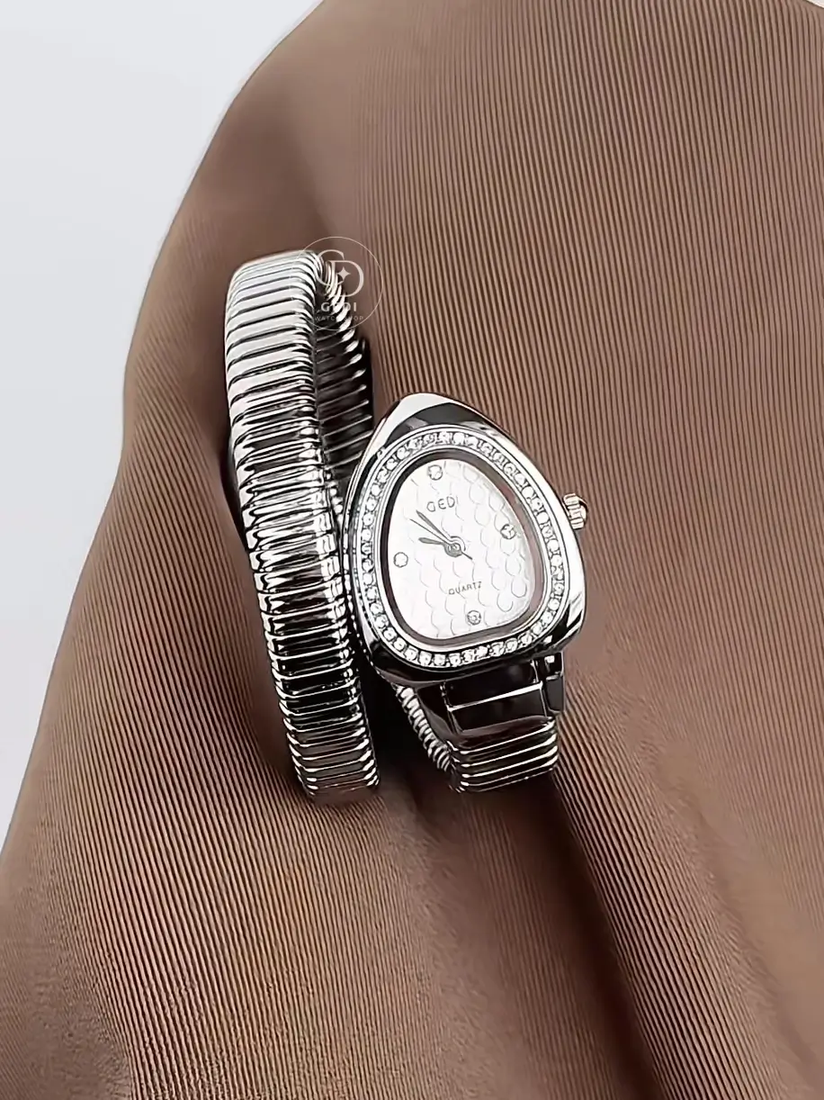 This luxurious snake-inspired bangle watch features a stunning water-drop dial encircled by shimmering crystals, designed to capture the light with every movement. The unique gold spiral band wraps gracefully around your wrist, blending the bold elegance of fine jewelry with the precision of a classic timepiece.