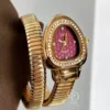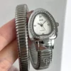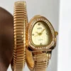 This luxurious snake-inspired bangle watch features a stunning water-drop dial encircled by shimmering crystals, designed to capture the light with every movement. The unique gold spiral band wraps gracefully around your wrist, blending the bold elegance of fine jewelry with the precision of a classic timepiece.