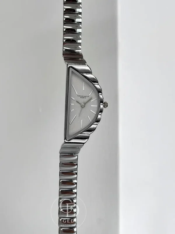This minimalist women’s watch features a unique half-moon-shaped silver dial paired with a polished bracelet. Clean hour markers and a smooth metallic finish create a modern yet elegant look that stands out without being overpowering.