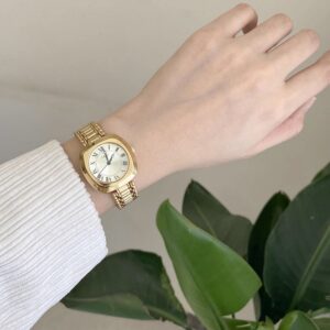 This minimalist-style ladies’ watch features a clean, square face with a simple yet sophisticated design, making it the perfect accessory for those who appreciate understated elegance. The gold-tone case and subtle dial create a modern look that is both stylish and timeless. With no unnecessary embellishments, this watch embodies the essence of minimalist design, allowing the beauty of its form to shine through. Whether you’re dressing up for a formal event or adding a touch of class to your everyday ensemble, this watch complements any occasion effortlessly.