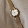 This minimalist gold mesh band watch features a luminous mother-of-pearl dial that shimmers beautifully under the light, adding a soft and elegant glow to your wrist. The slim gold mesh bracelet and sleek case create a refined, modern silhouette that’s perfect for everyday wear. Designed for women who appreciate understated luxury, this watch pairs effortlessly with any outfit — from casual ensembles to formal looks.