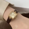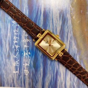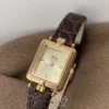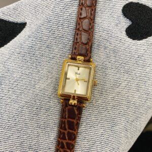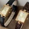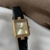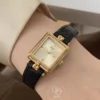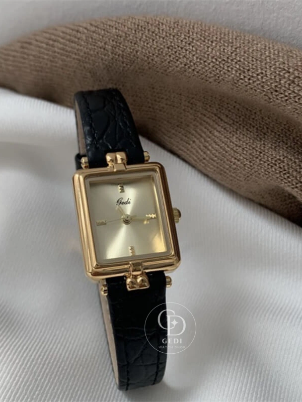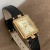 Vintage-inspired square quartz watch, featuring a minimalist and elegant design. The dial is beautifully framed in gold, complemented by a versatile black leather strap that pairs effortlessly with any outfit. A timeless accessory for every occasion.