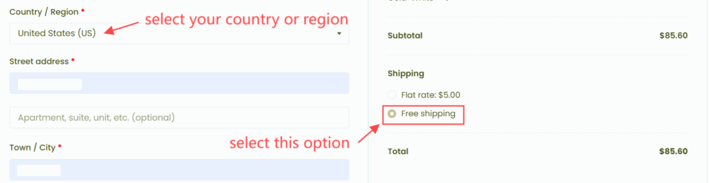 When you place your order, simply select your country and region at checkout. If your order meets the minimum amount for free shipping, you will see a “Free Shipping” option. Just select that option, and you’re good to go!